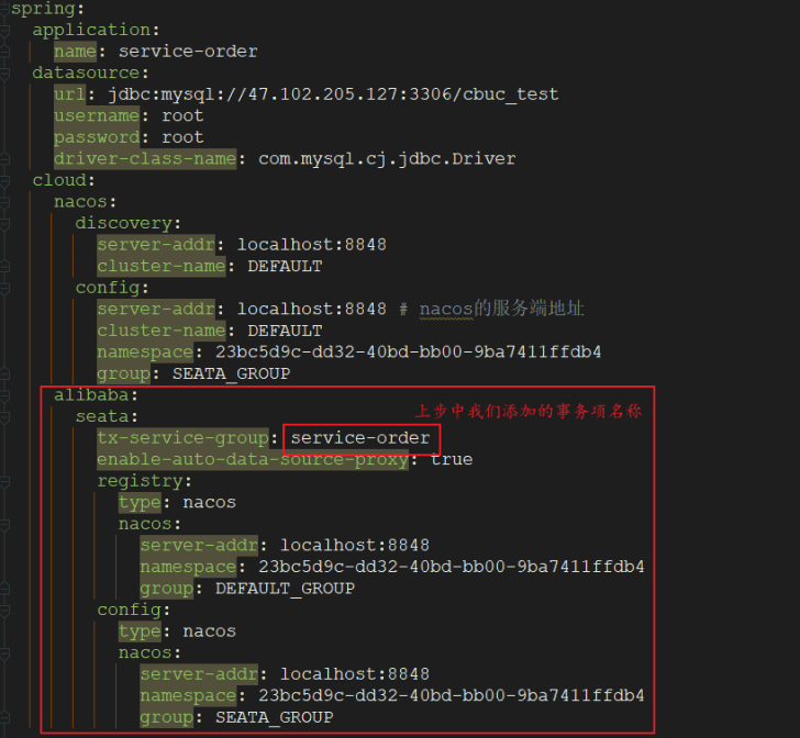 seata 依赖和nacos 配置依赖<!--nacos--> <dependency> <groupId>com.alibaba.cloud</groupId> <artifactId>spring-cloud-starter-alibaba-nacos-config</artifactId> </dependency> <!--seata--> <dependency> <groupId>com.alibaba.cloud</groupId> <artifactId>spring-cloud-starter-alibaba-seata</artifactId> <exclusions> <!-- 排除依赖 指定版本和服务器端一致 --> <exclusion> <groupId>io.seata</groupId> <artifactId>seata-all</artifactId> </exclusion> <exclusion> <groupId>io.seata</groupId> <artifactId>seata-spring-boot-starter</artifactId> </exclusion> </exclusions> </dependency> <dependency> <groupId>io.seata</groupId> <artifactId>seata-all</artifactId> <version>1.4.1</version> </dependency> <dependency> <groupId>io.seata</groupId> <artifactId>seata-spring-boot-starter</artifactId> <version>1.4.1</version> </dependency>1