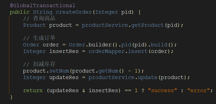 @GlobalTransactional注解,类似于我们单体事务添加的@Transactional