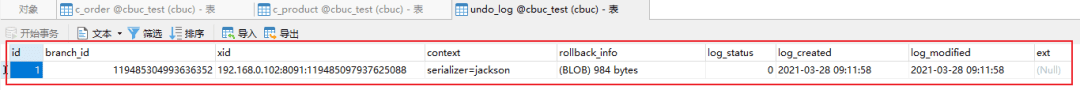 CREATE TABLE `undo_log` ( `id` BIGINT(20) NOT NULL AUTO_INCREMENT, `branch_id` BIGINT(20) NOT NULL, `xid` VARCHAR(100) NOT NULL, `context` VARCHAR(128) NOT NULL, `rollback_info` LONGBLOB NOT NULL, `log_status` INT(11) NOT NULL, `log_created` DATETIME NOT NULL, `log_modified` DATETIME NOT NULL, `ext` VARCHAR(100) DEFAULT NULL, PRIMARY KEY (`id`), UNIQUE KEY `ux_undo_log` (`xid`, `branch_id`) ) ENGINE = INNODB AUTO_INCREMENT = 1 DEFAULT CHARSET = utf8;1