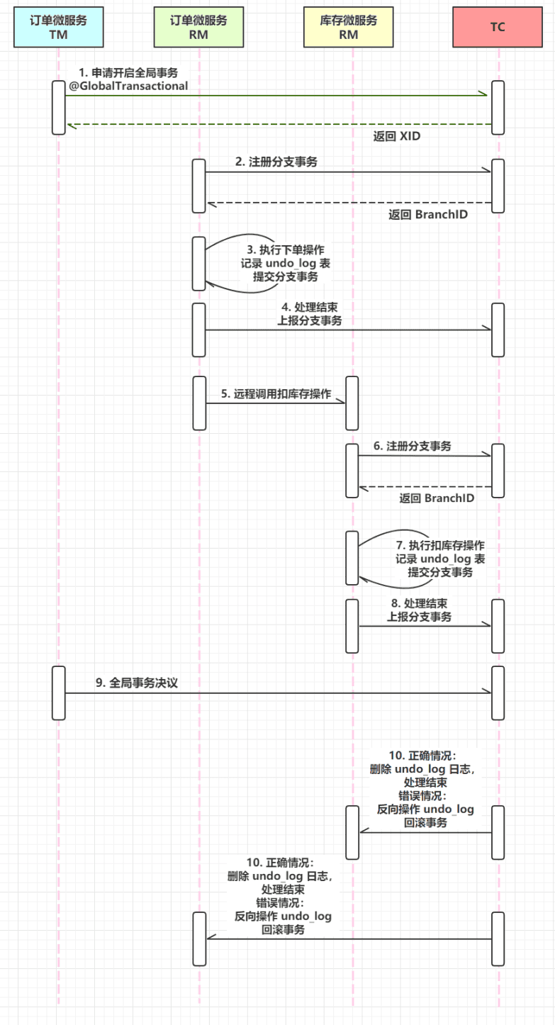 - 全局事务调用处理结束后,TM 会根据有误异常情况,向 TC 发起全局事务的提交或回滚
