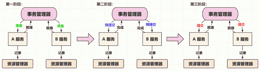 ACK表示我已经准备好提交了。 - DoCommit:这个就断就是从 预提交状态 转为 提交状态。事务管理器向各个参与者发送 提交 请求,参与者接收到请求后,就会各自执行自己事务的提交操作。将处理结果记录到自己的资源管理器中,并向协调者反馈