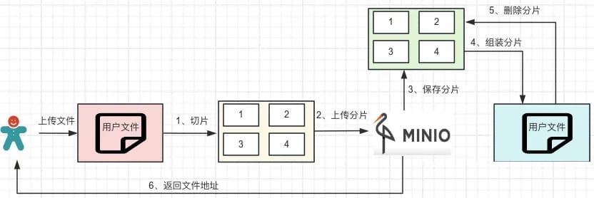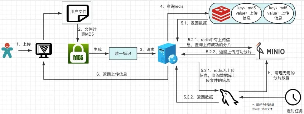 大文件分片上传需要前后端协作来完成,前端的工作是切片和生成文件的唯一标识;后端的工作是接收文件的唯一标识,记录文件上传的分片信息和整合分片成完整文件。下面设计一套前后端协作方式将大文件分片上传到MinIO上的方案。
