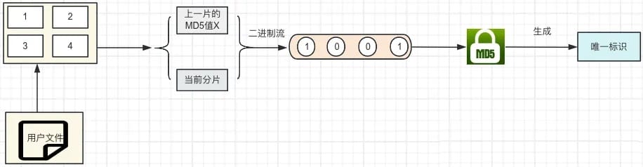 前端需要唯一的标识一个文件,然后将唯一的标识传给后端做文件识别,那么用什么来唯一的标识一个文件呢?目前比较成熟的方案是将文件的二进制数据采用MD5映射成一个唯一标识。