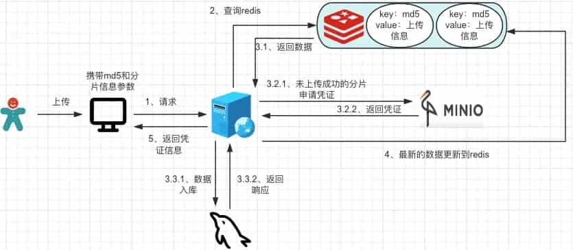 如果当前的文件是没有上传过或者断点上传的时候,需要携带md5和分片信息请求后端,后端根据MD5查询Redis中上传文件的信息来申请凭证,如果是断点续传情况,需要过滤已经上传成功的分片再去申请凭证;凭证通过后保存数据和更新Redis,然后返回凭证信息、uploadId给前端。