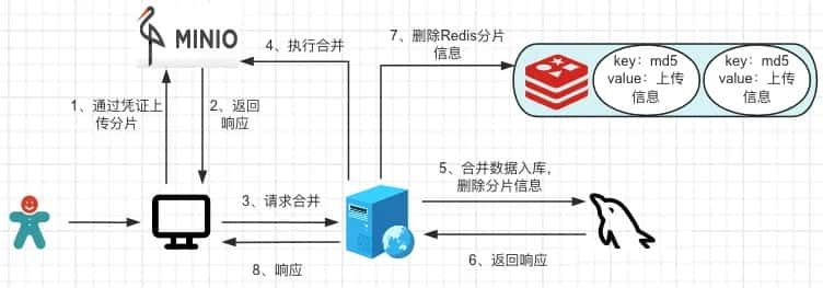 前端通过后端的凭证开始上传分片信息,分片上传完成之后请求后端将分片的合并成一个完整的文件,然后获取到完成的文件地址保存到数据库。