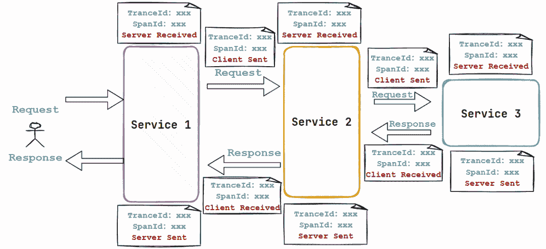 这一串字符中包含的信息有 服务名 / TraceId / SpanId。依次调用有一个全局的 TraceId,将调用链路穿起来。通过分析微服务的日志,不难看出请求的具体过程