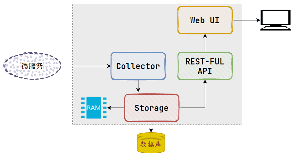 - Storage: 存储组件。主要用于对处理收集器接收到的跟踪信息,默认会将这些信息存储到内存中,我们可以修改存储策略,将其存储到我们的其他存储仓库中