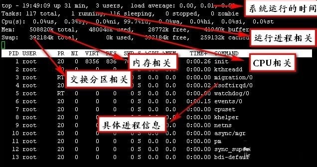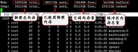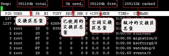 Swap: 192772k total 交换区总量 0k used 使用的交换区总量 192772k free 空闲交换区总量 123988k cached 缓冲的交换区总量,内存中的内容被换出到交换区,而后又被换入到内存,但使用过的交换区尚未被覆盖,该数值即为这些内容已存在于内存中的交换区的大小,相应的内存再次被换出时可不必再对交换区写入。1