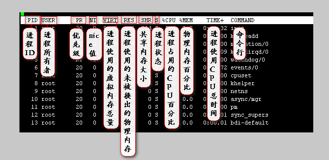 #进程信息区统计信息区域的下方显示了各个进程的详细信息: a PID 进程id b PPID 父进程id c RUSER Real user name d UID 进程所有者的用户id e USER 进程所有者的用户名 f GROUP 进程所有者的组名 g TTY 启动进程的终端名。不是从终端启动的进程则显示为 ? h PR 优先级 i NI nice值。负值表示高优先级,正值表示低优先级 j P 最后使用的CPU,仅在多CPU环境下有意义 k %CPU 上次更新到现在的CPU时间占用百分比 l TIME 进程使用的CPU时间总计,单位秒 m TIME+ 进程使用的CPU时间总计,单位1/100秒 n %MEM 进程使用的物理内存百分比 o VIRT 进程使用的虚拟内存总量,单位kb。VIRT=SWAP+RES p SWAP 进程使用的虚拟内存中,被换出的大小,单位kb。 q RES 进程使用的、未被换出的物理内存大小,单位kb。RES=CODE+DATA r CODE 可执行代码占用的物理内存大小,单位kb s DATA 可执行代码以外的部分(数据段+栈)占用的物理内存大小,单位kb t SHR 共享内存大小,单位kb u nFLT 页面错误次数 v nDRT 最后一次写入到现在,被修改过的页面数。 w S 进程状态(D=不可中断的睡眠状态,R=运行,S=睡眠,T=跟踪/停止,Z=僵尸进程) x COMMAND 命令名/命令行 y WCHAN 若该进程在睡眠,则显示睡眠中的系统函数名 z Flags 任务标志,参考 sched.h1