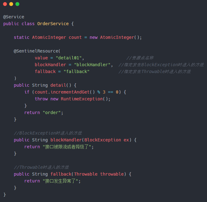 该注解的作用就是用来定义资源点。当我们定义了资源点之后,就可以通过 Sentinel 控制台来设置限流和降级策略来对资源点进行保护。同时还可以通过该注解来指定出现异常时候的处理策略。