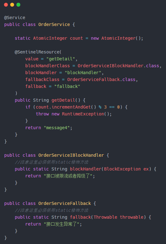 | blackHandlerClass | 存放 blockHandler 的类,对应的处理函数必须用 static 修饰 |