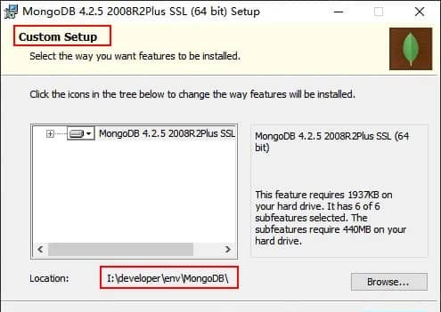 运行MongoDB安装包并选择自定义安装,设置好安装路径;