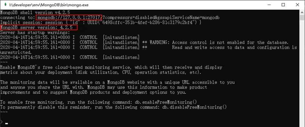 mongo.exe可以运行MongoDB自带客户端,操作MongoDB;连接成功后会显示如下信息;