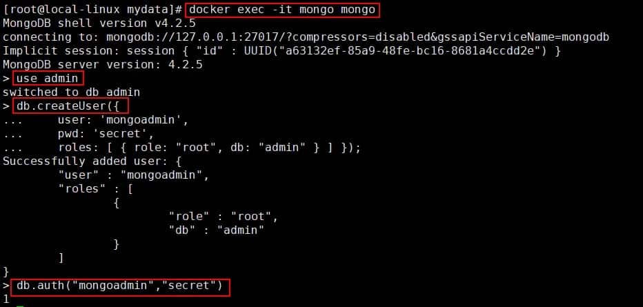 docker run -p 27017:27017 --name mongo \ -v /mydata/mongo/db:/data/db \ -d mongo:4.2.5 --auth1